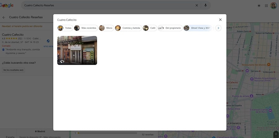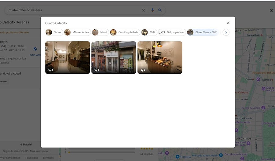 Google mostrará por defecto en su ficha solo el street view, posiblemente desactualizado de su negocio. Puede mejorar esto agregando sus fotos, mostrando a sus clientes imágenes inmersivas 360º.